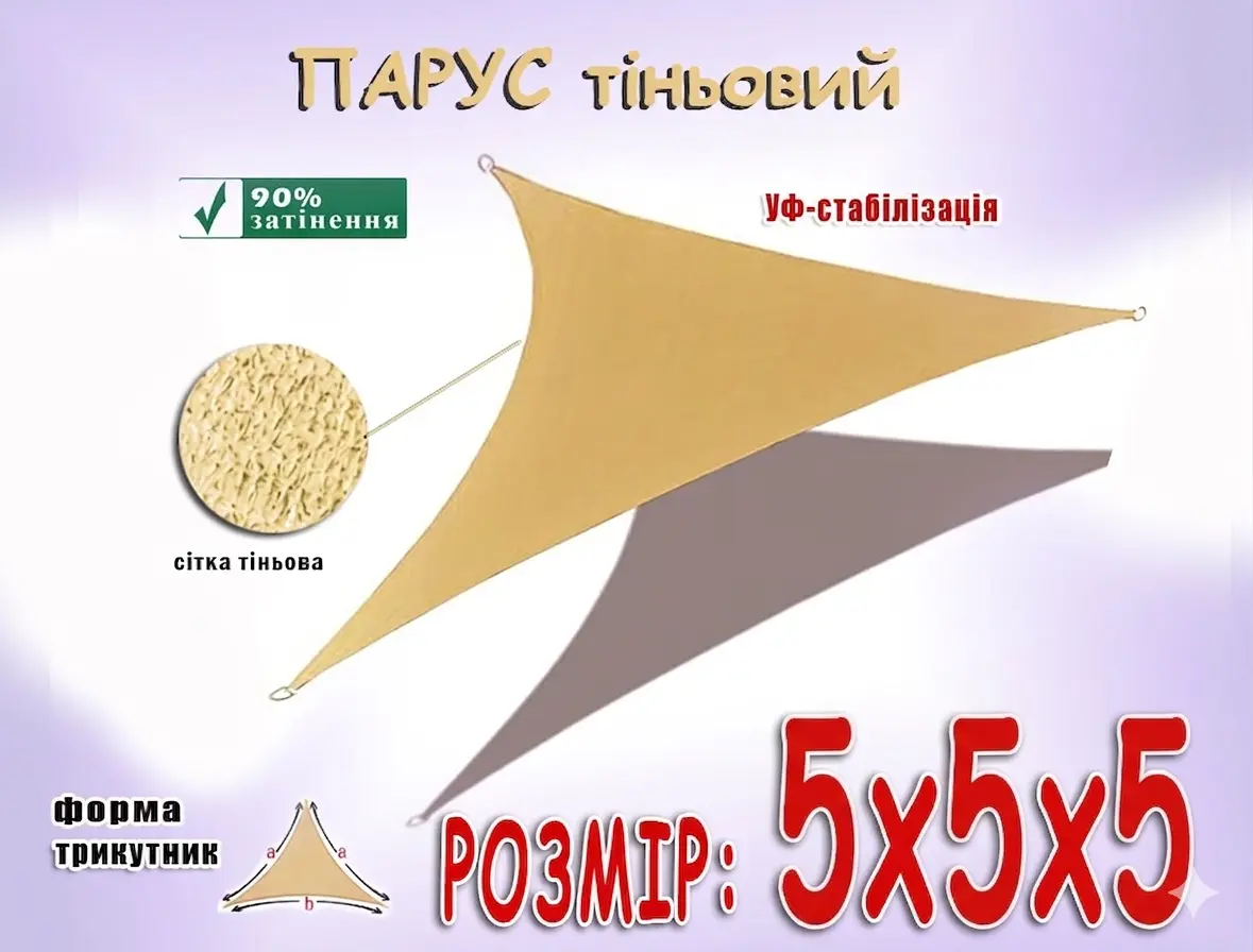 Полотна прошиты плотной киперной лентой (в размерах до 6м), предусмотрены карманы для троса (в размерах от 6 до 15м), по углам установлены металлические кольца (4мм).Стойки выполнены из стальной круглой трубы, покрытие полимерное (цвет на выбор). Винтовые сваи (для фиксации стойки) выполнены из оцинкованной стали.Ниже приведена таблица стандартных теневых парусов с ценами. Цены на стойки выведены в отдельную таблицу.