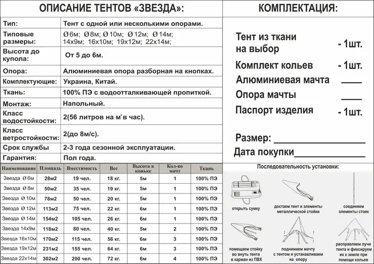 Шатер тент "Звезда" - можно использовать как для выставок, презентаций, корпоративных мероприятий так и для личного пользования для отдыха на природе.В течение 15-30 минут такая конструкция собирается двумя-тремя людьми.Габартиные размеры тента Звезда позволяют перевозить малогабаритным транспортом.Место установки может быть и песок и асфальт.При качественной и правильной установке такая конструкция может выдерживать скорость ветра более 8 метров в секунду благодаря характерному аэродинамичному профилю !